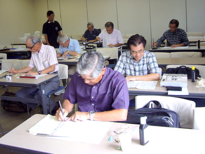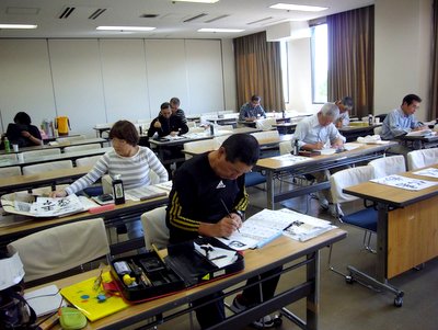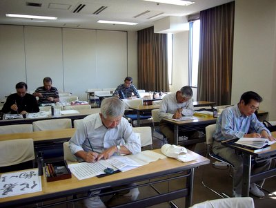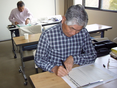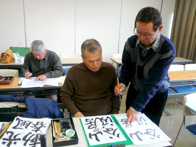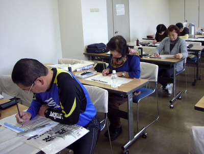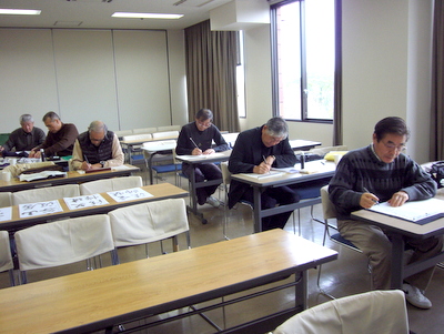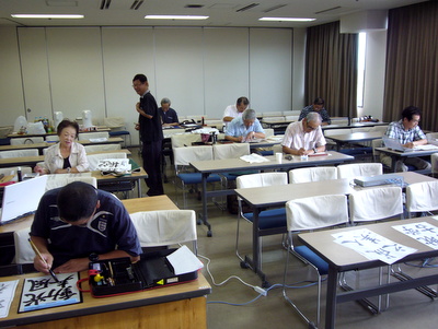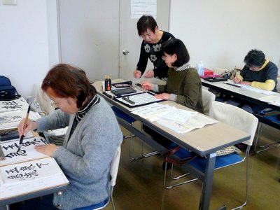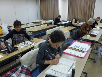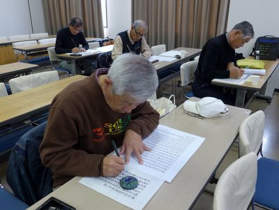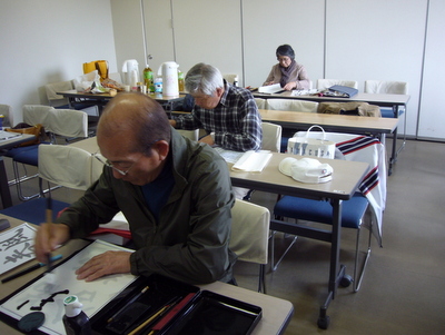 四文字・写経などの手本を教材にし、先生から筆跡や筆運びなどの指導を受け、一枚を仕上げるのに時間が過ぎました。