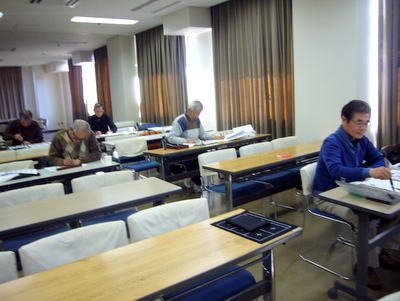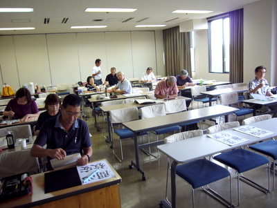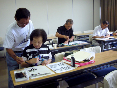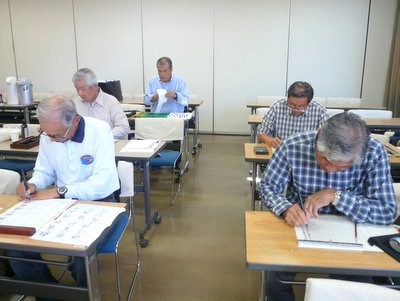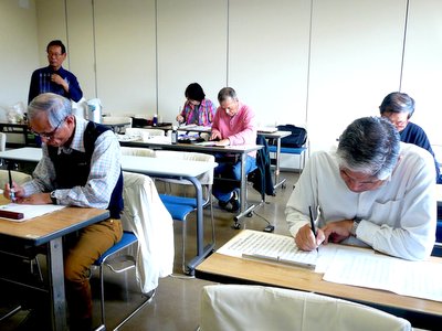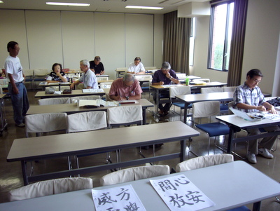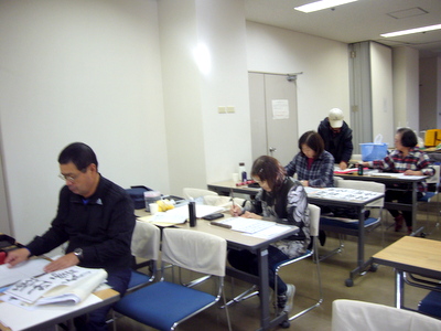 講師から各人の筆跡を見て文字間隔やバランス等に的確なアドバイスを受け取り組んでいます。 私はこの