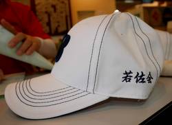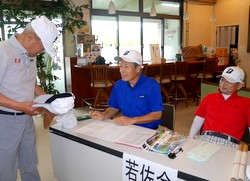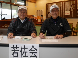 受付前にて 若佐会の帽子 新メンバー紹介(阿部さん) |