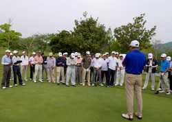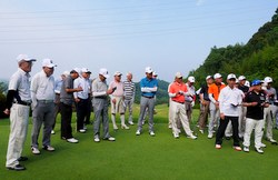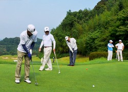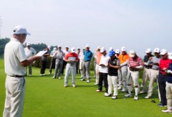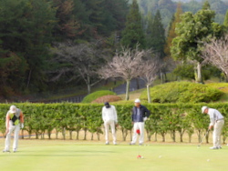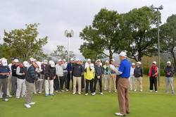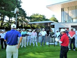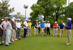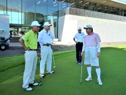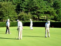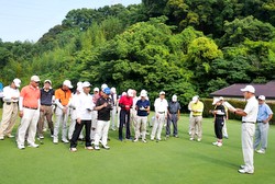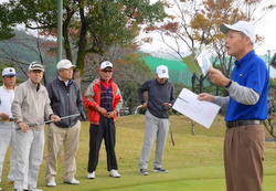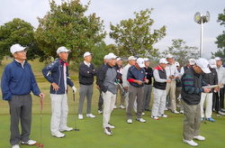 練習グリーンでパターの練習に熱中 世話役からの競技説明 |