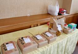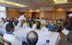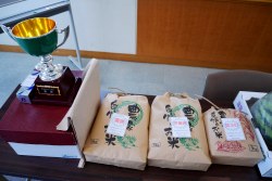 世話役からの競技説明 表彰式までの懇談風景 沢山のお米、フルーツなどの賞品 |