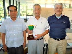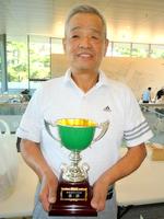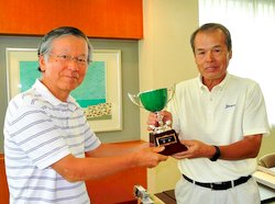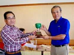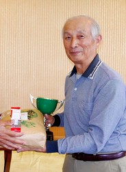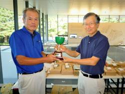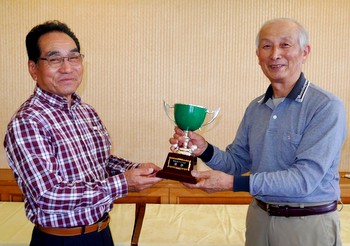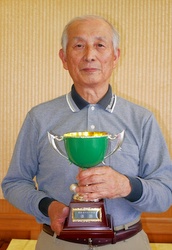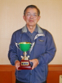 優勝の大江さんに優勝カップと賞品の授与 優勝カップを手にエージシューターの大江さん |