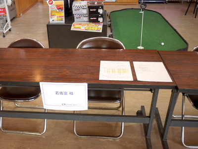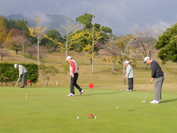 受付のお二人 練習グリーンでパターの練習に熱中 |