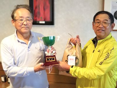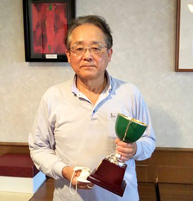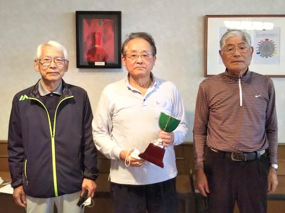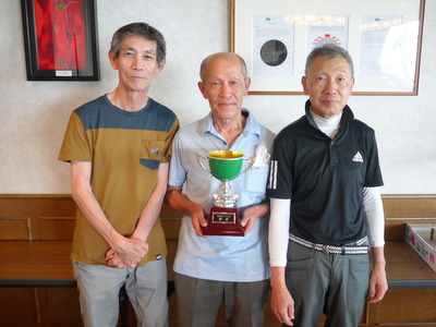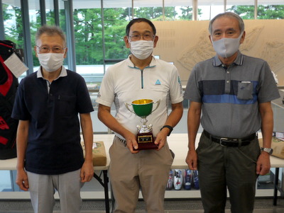 優勝の徳永さんに優勝カップと賞品の授与 藤木さん(2位) 徳永さん(優勝) 宮原さん(3位) |