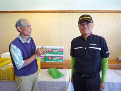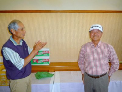 挨拶。二位は私(吉田)、三位は武広 正行さんでした。準備して頂いた沢山の賞品を手に、次回5月15日大和不動CC