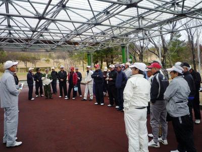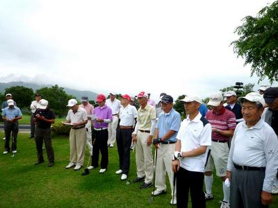 開会式は、43名の参加者全員の記念撮影の後、初参加の矢野勇さんの紹介と挨拶、恒例の前回優勝者の江口孝司さんの始球式でプレーを開始しました。