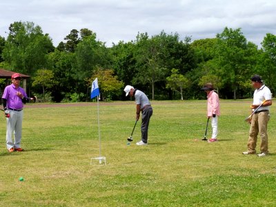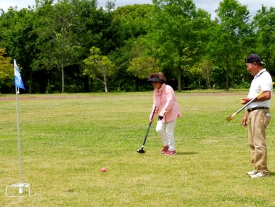 今回は初心者も多く、最初に練習ラウンドを行い休憩の後に本戦の競技を2ラウンド行いました。慣れない芝コースに思うようにボールも転がらず悪戦苦闘。あちこちで歓声と拍手が上がる中、4名の方が「ホールイン・ワン」を達成されました。