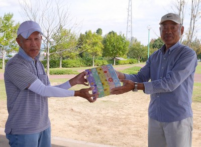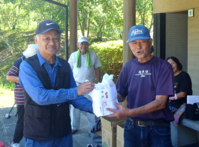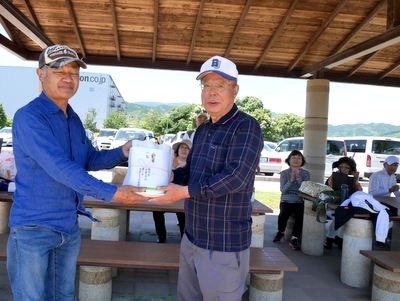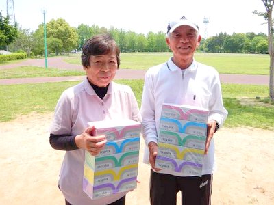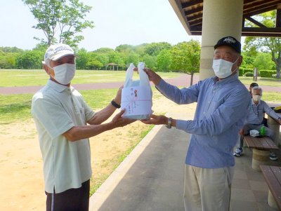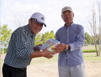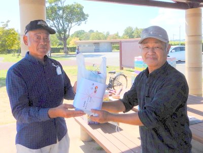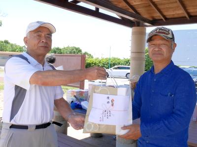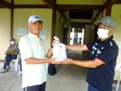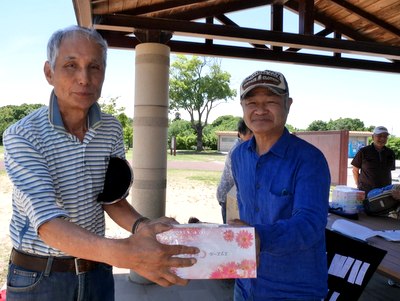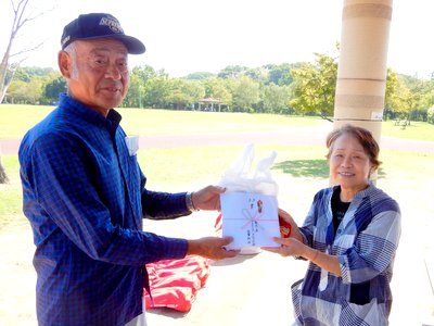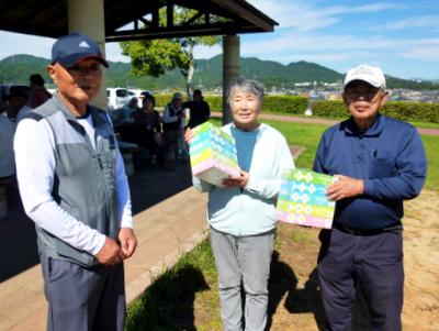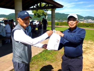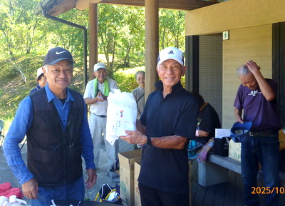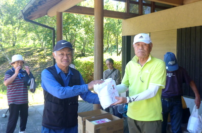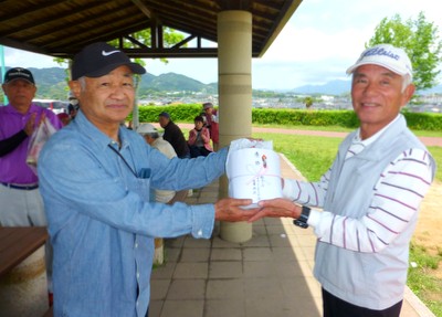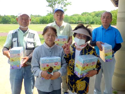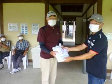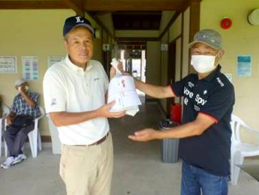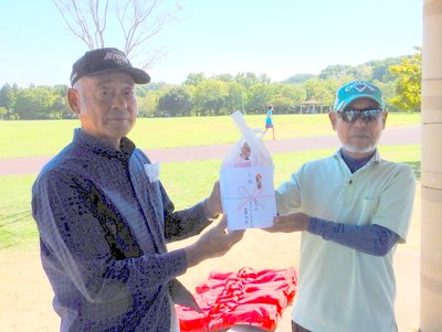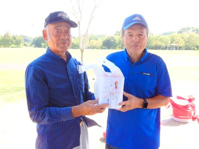 久しい再会に旧交を温めながら和気藹々の内に競技が終了。早川幸夫さんが見事「39」のスコアで優勝。賞品の「洗剤セットの大盛り」を獲得されました。参加賞には「ティッシュベーバー」を全員が頂き次回の開催を期待し散会となりました。