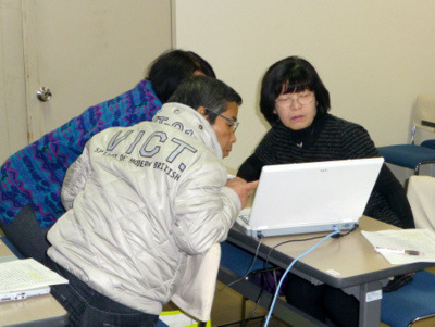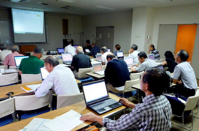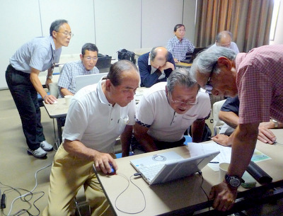 | エクセルl関数を熱心に実習 初参加の宮崎重信さんの挨拶 |