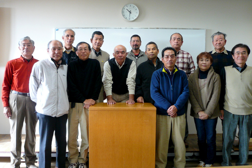 | 今回の講師は黒髪哲男さん 羽根信夫さんからハンディキャップ算出法を聞く若佐会世話役の皆さん |