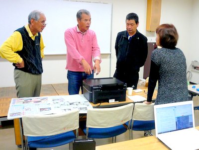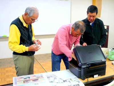 4月21日 第51回のパソコン交流会を、7名の参加で開催しました。テーマは「安価でのプリンターインク交換をしてみよう」です。当日は小林さんが使用を控えている印字不良のプリンターを持参いただき、また宮崎さんには事前にそのプリンター用の交換インクセットインクヘッド洗浄セットを用意して頂き、インク交換とヘッドの洗浄に挑戦しました。アマゾンから購入した、廉価版の互換インクセットはICチップも入っており、事前に用意していたカセットのリセッターを使用する必要もなく、簡単にインクの交換は出来ました。しかしながらしばらく使われていなかったヘッドの洗浄については、洗浄セットだけではなく綿棒にお湯をしみこませてインクの解けるのを待ちましたが完全にはよくなりません。しばらく状況を見て頂くことで交流会は閉会しました。