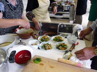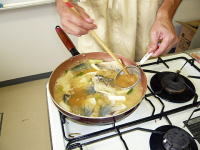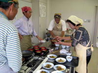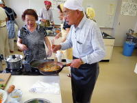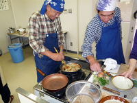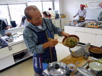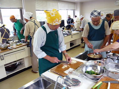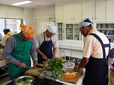 | 10月6日(月) 佐賀地区「男性のための料理教室」を開催しました。かねてより会員からの開催要望が強く、幹事が奔走され、鳥栖市の食生活改善推進活動メンバーの方々のご協力を得て実現しました。 日頃料理とは疎遠の方や、積極的に取り組んでおられる方等、参加者の料理への関わり方にはばらつきがありますが、「自分で料理が出来る」ことの必要性を感じておられる方が殆どのため、講師の話に真剣に聞き入っていました。 実習は、米の研ぎ方から始め、かき卵汁、きんぴらごぼう、さばの味噌煮、ほうれん草のナムル、豆乳プリン等、日頃どこの家庭でも食卓に上っているようなメニューを準備して頂き、ヘルスメイトの皆さんの補助で和やかに行われました。 料理完成後の試食会は、それぞれの出来ばえや苦労話しを語りながらの反省会となり、その中でも「さばの味噌煮」の評判が大変良く、「自分で作って家族に食べさせたい」との感想が圧倒的に多く、満足されていました。開催のお膳立てをされた小林幹事も安堵の様子で、さらに会員からは今後も是非続けて欲しいとの要望が多く寄せられ、次なる目標を検討する事になりました。(加藤進一郎 記) |