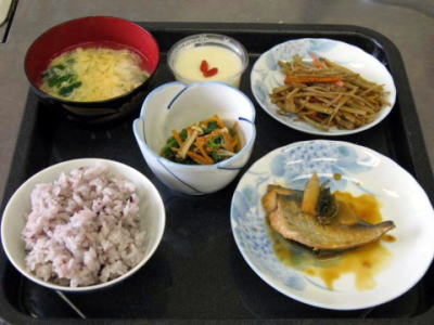 健康的な食事・調理実習のレシピ ‥鳥栖市保健センター 管理栄養士/宮井先生作成 (757Kcal) ★黒米ごはん ★かき卵汁 ★さばの味噌煮 ★ほうれん草の和風ナムル ★きんぴらごぼう ★豆乳プリン |