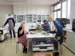 分かれ料理開始です。今回は主として男性が調理を進め女性がサポートして頂きながら、梅林先生の手ほどきを