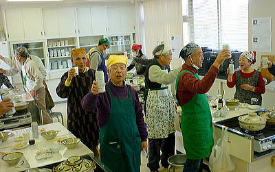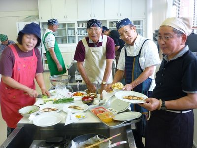 その後、世話人橋本と有志の神代さんが今日の献立を説明。グル-プ毎に楽しみながらの料理を進め、皆さん、世話人顔負けの包丁さばきに感心しきりの声。段取りも良くスム-ズに進行、予定時間内に出来がりました。