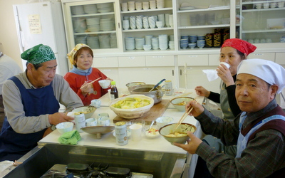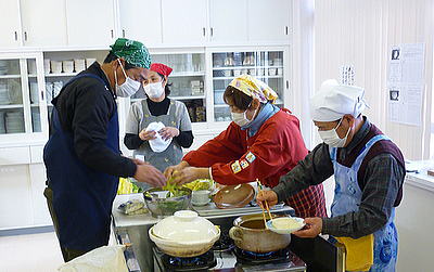 | グループ毎に鍋を囲み楽しく試食会 |