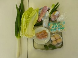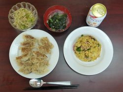 今回のメニューは中華の定番、「餃子」・「チャーハン」・「ささみの中華サラダ」・「わかめスープ」とデザートは