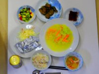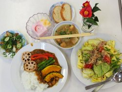 しぎ焼き」「野菜と豆のサラダ」・「野菜たっぷり塩麹スープ」・「冬瓜のあんかけ」とデザートはコーヒーゼリー&シソ