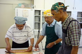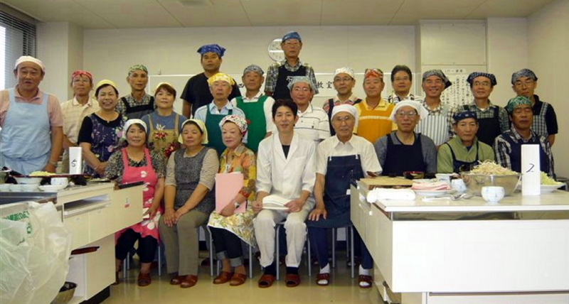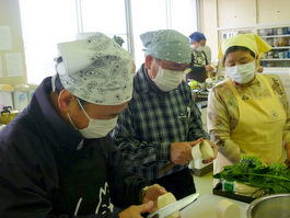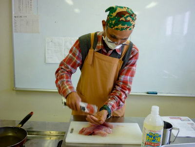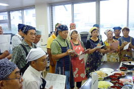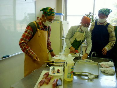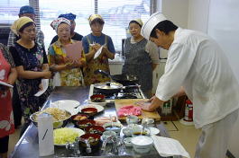 講師の実演指導を熱心に聞く皆さん 料理の下段取り