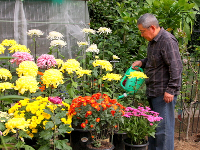 | 橋本文則さんの菊つくり 2年前から育て始めた菊が咲いたとの便り。早速ご自宅を訪ねました。取材撮影:加藤進一郎さん |