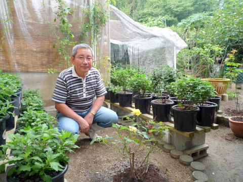 | 美しく咲いた薔薇を愛でる橋本さん |