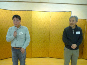 | 中嶋幹事の挨拶 | 新会員の西橋さん(左)と山川さん 岡さん(初参加)の自己紹介 | |