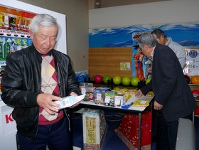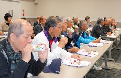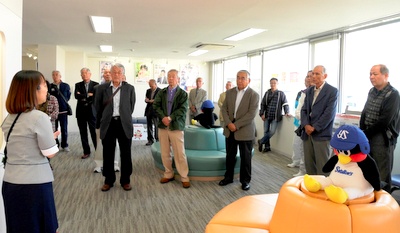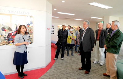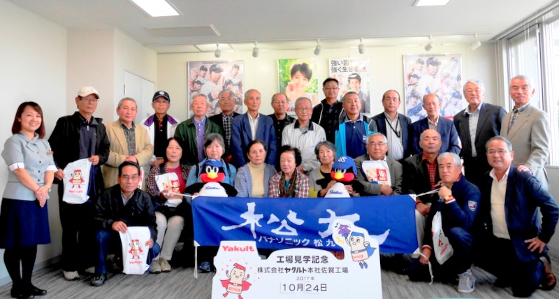 | 10月24日、24人が参加して神埼市のヤクルト本社佐賀工場を見学した。佐賀工場は昭和40年に神崎に進出し、ヤクルト、 ジョア、ミルミルなどの乳生産を生産している。 佐賀工場高尾さんの説明、案内により、まずジョアを作る工程、ジョアタンクを見学。ジョアタンクは直径3m、高さ5.7mの巨大な もので粉ミルクに乳酸菌シロタ株を入れて培養、さらにシロップで調合(味付け)攪拌して仕上げている。次にジョア充填工程を見学。残念ながら切り替え中のため設備を見るだけ、稼働状況はビデオによる見学となった。マスカット、ストロベリー、ブルーベリーの 3種類のジョアが一秒間に8本というスピードで生産されている。続いて大腸で働くビフィズス菌を使用したミルミルの製造工程。光に弱い、空気に弱いというビフィズス菌を閉じ込めるために紫外線を通さないパッケージを空気が入らないように箱を組み上げながら充填している。さらに理化学検査設備による検査の説明やヤクルト容器による排水処理システム、太陽光発電などの環境の取り 組みの説明を受けた。その後、会議室でジョアを試飲しながら創始者代田稔氏の病気にならないための予防医学として腸を健康に保つ乳酸菌に着目しヤクルト誕生に至るDVDを鑑賞し、乳酸菌、ビフィズス菌の効能についての理解を深めた。質疑では数多くの 質問が飛び交い説明の高尾さんも戸惑う場面もあった。 最後にヤクルトスワローズのマスコットつば九郎と一緒に全員で記念撮影をして工場見学を終了した。 (レポーター 前田 究) |
