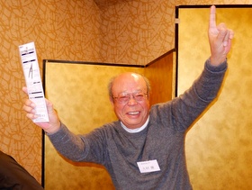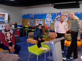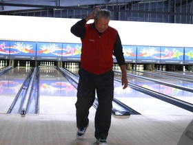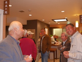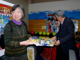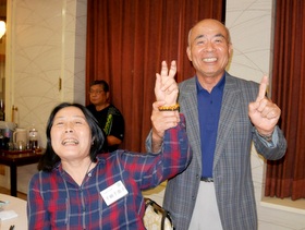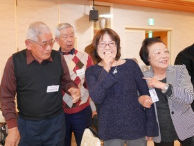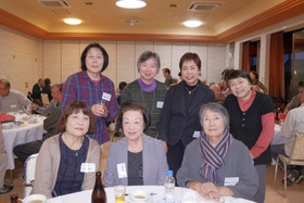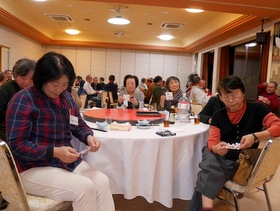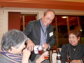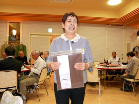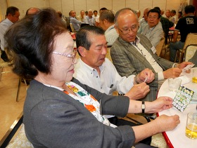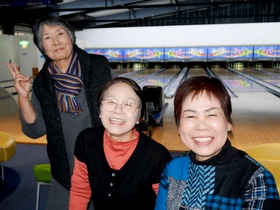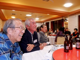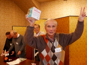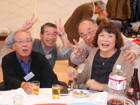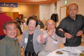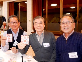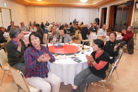 | 年末懇親会に先立ち、筑紫野スポーツプラザで「第6回ボウリング大会」を19名の参加で開催。全員が1年振りながらも個性あるフォームでゲームを楽しみ、溜息や歓声が飛び交う中、優勝は安定したプレーの中嶋克彦さん、2位は昨年優勝者の千綿千恵子さん、3位は地区幹事の小倉敏彦さんでした。全員が何らかの賞品を頂いた表彰式後は、多くの珍プレー談義に花を咲かせながら懇親会場の光林飯店に移動。 年末懇親会は60名の方が参加。良い顔での記念写真後、平世話人の司会で開始。小倉幹事の挨拶(健康で有る事が一番です)、小副川地区委員による「月日が経つのを早く感じる事は残りの日々が少なる事です^|^。元気な再会に感謝」の乾杯で楽しい宴に入る。各テーブル(松・竹・梅・亀・鶴・扇・福・寿)には、久し振りの再会で話の輪が絶えず、美味い酒が更に楽しいひと時を過ごさせてくれました。カラオケクラブや自称プロの方の歌には今回も感動し大喝采、宮崎重信さんの流暢な語りによるビンゴゲームも、一喜一憂し大いに盛り上がる。まだまだ心残りが有る中、加納地区委員による全員のご健勝と来年5月の総会での再会を祈念した一本締めで楽しい宴を終わりました。 (レポーター 徳永敏夫) |