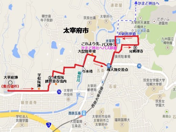 | ウォーキングルート | 大宰府政庁跡⇒学校院跡⇒戒壇院⇒僧正玄ムの墓⇒観世音寺⇒国宝梵鐘⇒光明禅寺⇒(バス)⇒竈門神社 | ||