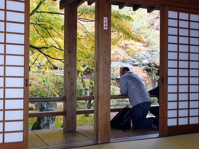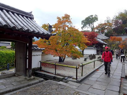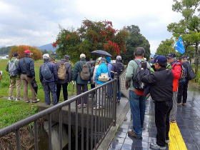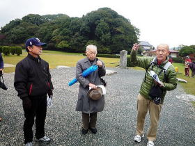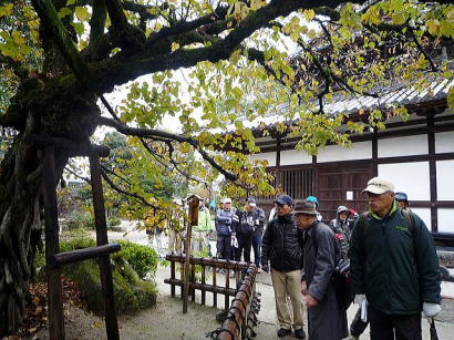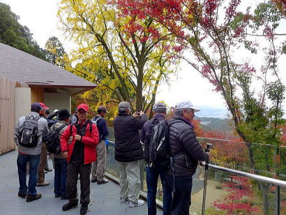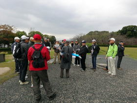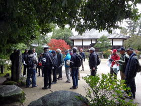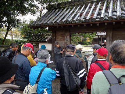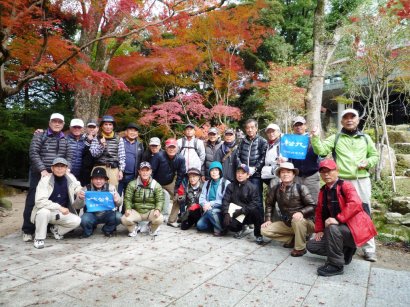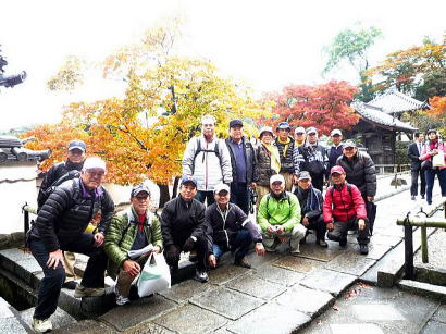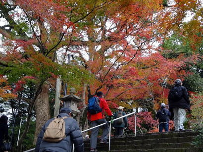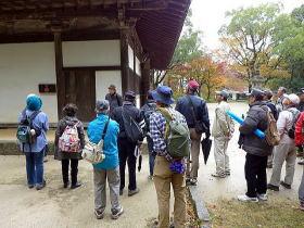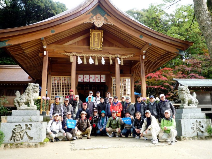 | 今回は「歩かんね大宰府°C持ちよかやん、風も人も」をテーマに古都大宰府の紅葉と史跡巡りを楽しみました。初冬の寒さと時雨の中、参加者27名はJR及び西鉄電車を利用し大宰府政庁跡に集合し、94才(大正8年生)の今も元気なガイドの貞刈さんと合流。早速、特別史跡の「遠の朝廷」で復元された建物の礎石と学術的詳細な説明で往時を偲んだ後、学校院跡、僧尼の登壇授戒の場であった戒壇院と日本最古級の梵鐘(国宝)がある観世音寺での学びと境内の紅葉を愛でる。 続いて御笠川沿いの遊歩道を散策しながら、大宰府天満宮の南にあり、苔寺の名で親しまれている光明禅寺に到着、ときを忘れる静粛な枯山水の庭とモミジの紅葉を堪能した後、コミニュティバス(まほろば号)で「縁結びの神様」として信仰を集める創建1350年を機に新築された社務所が建つ竈門神社へ着く。 食事処「おたふく」で味のおもてなしと歓談後、紅葉のトンネル石段を登り境内へ着き参拝。趣きある展望所と境内で見ごろの紅葉を眺めながら心洗われる。散策後は晩秋の霊峰・宝満山を背にバスで西鉄都府楼前駅へ着き、岐路へ。(レポーター:徳永敏夫 記) |
