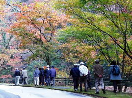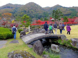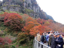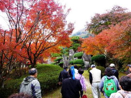 昼食後、ダム記念公園の「溪石園」でガイドさんと合流し、2万平方メートルの日本庭園内の紅葉を愛でる。次にダムと湖畔の紅葉を見ながら深耶馬渓の「一目八景」へ。ガイドさんの案内で土産店通りを歩きハ角形の展望台で説明を聞きながら溪谷の紅葉に感嘆する。帰路は紅葉のトンネル道路を走り、道の駅・童話の里くすでお土産を購入後、玖珠インター経由で夕やみの鳥栖に到着。晩秋の肌寒い日でしたが楽しく過ごすことが出来ました。次回