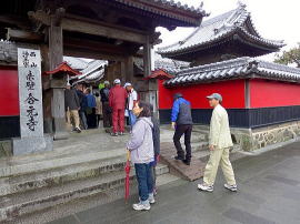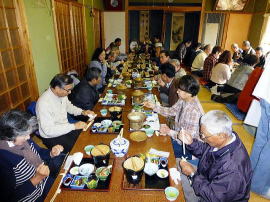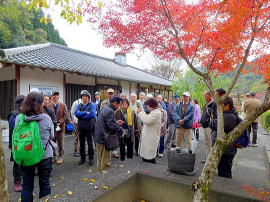 ドラマはクライマックスになり多くの観光客で賑わう中、日本三大水城のひとつである城内の官兵衛資料館で知識収集し天守閣を見学、改めて官兵衛の偉大さを痛感しました。寺町通りの合元寺(通称:赤壁寺)では赤壁を前に謀殺された官兵衛の宿敵・宇都宮鎮房と従臣に手を合わせる。福澤諭吉旧居・記念館で諭吉の人となりを学んだ後、耶馬溪ダム近くの食事処「天雲龍」へ。眼下の紅葉を見ながら耶馬の里料理「鮎のせせらぎ膳、もみじ(鹿)鍋膳、猪のお茶しゃぶ膳」を頂きながら、こころゆるりと歓談しました。
