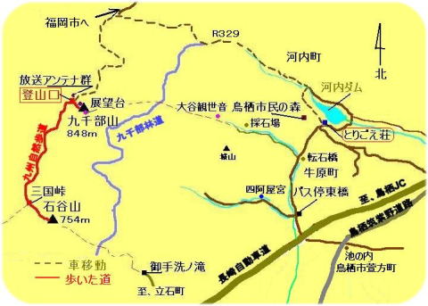 | 山歩きルート | 九千部山10:55⇒11:35小休止:45⇒12:00石谷山13:00⇒:40小休止:55⇒14:10九千部山14:15 | ||