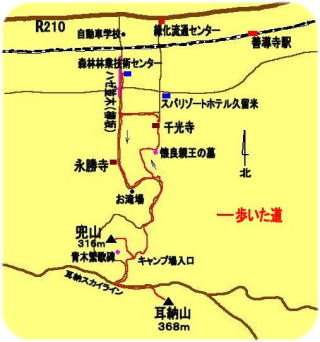 | 山歩きルート | 櫨並木9:50⇒10:10永勝寺:25⇒11:15兜山(:35耳納山:45)⇔12:00兜山13:10⇒:55千光寺14:05⇒:25櫨並木 | ||