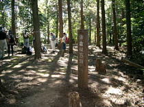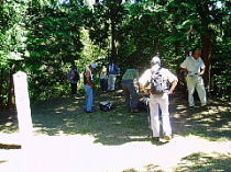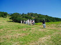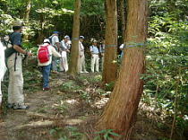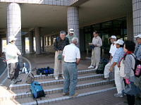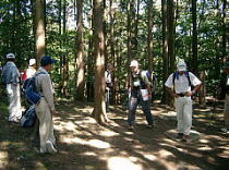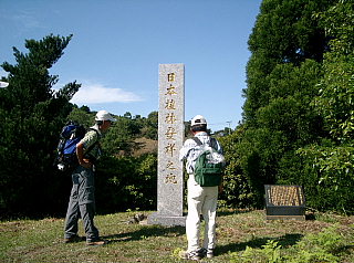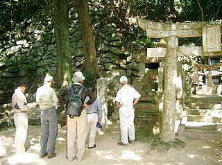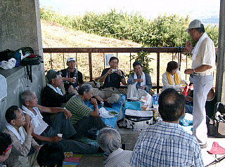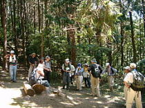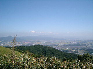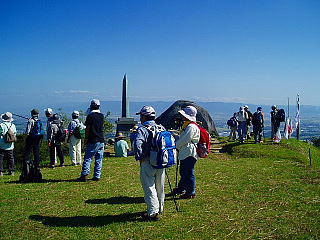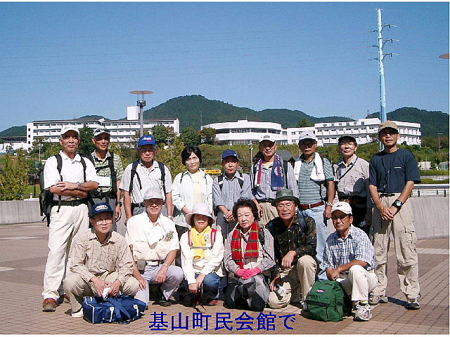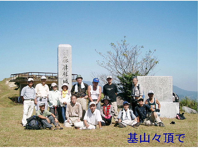 | 全員が基山町民会館へ集合。予定確認後、集合写真を撮る。目指す基山を前に見て、グランド横を出発。有料道路を越え、城戸集落を抜ける。やがて、水門跡に着き史跡を見ながら休憩する。少し上って基山々頂歩道と分れ、史跡巡りコースへ進む。山道に入り、植林の中で涼しくなる。坂道から平な米倉跡に着き小休止、更に鐘撞跡・つつみ跡や平らな土塁線の上を進み東北門跡へ。南へ下って谷を渡り山腹を上ると倉庫跡のの礎石が見られ、上ると土塁上へ出て左上の基山々頂へ。眺望も良く東に筑紫平野が広がり、耳納連山・古処山・宝満三郡山系、西に九千部山・背振山の山々、北に博多湾も見える。快晴の天気に陽射しが強く、展望台下で和やかに昼食休憩。一等三角点のある山頂と、いものがんぎを廻って草スキー場へ。帰路は林道を下り瀧光徳寺を経て、全員無事に町民会館に到着。天気に恵まれ(10月なのに季節はずれの暑さ)、地元にある(史跡巡りコースは初めての人も多かった)日本最古の山城、基肄城跡を巡る里山歩きを楽しむ事ができた。 |
