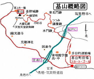 | ◇基山町民会館⇒水門跡⇒史跡めぐりコース⇒基山⇒草スキー場⇒林道⇒瀧光徳寺⇒町民会館 |