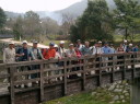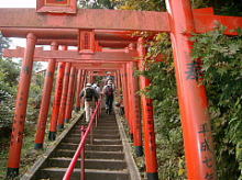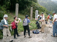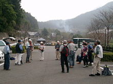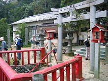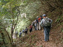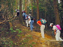 竜岩自然の家≠ノ流れる宝満川の橋上で写真を撮り、入る前に小休止する。小沢の水音が小さくなると急坂になり、皆の声も小さくなる。まもなく林道へ、ひと息いれ坂道を上る。鳥居の上の岩場に小さな扇滝がかかり、荒熊稲荷もある。水量は少ないが4〜5mの滝である。この辺りから道は緩やかになり自然林の中の歩き易い九州自然歩道を進む。道脇にある禊場や奥の院を過ぎて、赤い鳥居の長い石段を上ると大根地神社の境内に入る。由来によれば、神宮皇后が大根地大神を祭り祈願されたと言われ由緒ある神社である。神社を過ぎ右に廻り込んで電波反射塔の前を進むと大根地山々頂に着いた。薄曇の霞空で山頂からの展望は良くない。記念写真を撮り、昼食休憩する。おにぎりと温かい味噌汁とコーヒーが美味しい、次回や来年の山歩きへ話がはずみ和気藹々の一時である。今回も天気に恵まれ、自然景観が素晴らしい往復6kmの自然歩道の森林浴を楽しんだ里山歩きの一日であった。