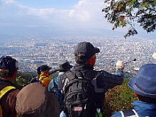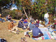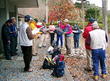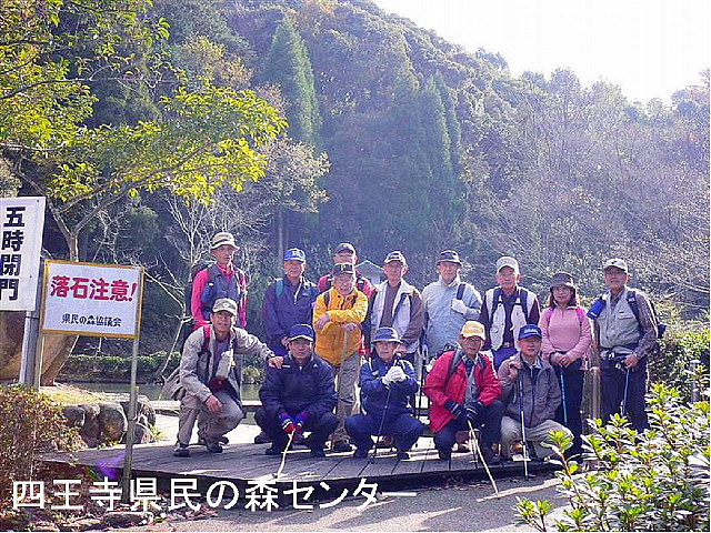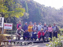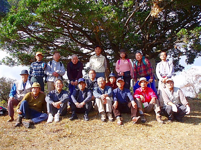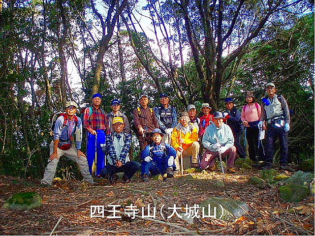県民の森センター≠ゥら紅葉が残るもみじ谷を登る。土塁へ出て、木漏れ日の中の遊歩道を歩く。途中、展望台で視界が開けて、市街地の先に博多湾・背振山・九千部山・空港が広がっている。毘沙門天と大城山の頂上に立寄り記念写真。樹林を下って、野外音楽堂に出て三名と合流した。