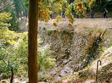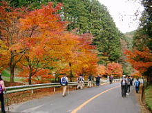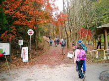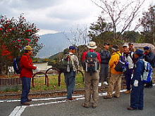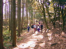ここから東へ向うと視界が開け、宝満山・三郡山・若杉山の大きな連なりが見える。下ると百間石垣を通って車道へ出た。渓流沿いの紅葉と滝が綺麗である。橋を渡り舗装道を進んで、東の土塁山道へ入る。緩やかな登りは展望のないコナラ林が続いて、大原山の頂上に到着。眼前に宝満山を見ながら、日溜りの小さな広場で昼食休憩する。