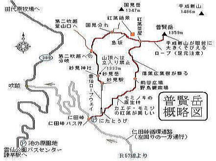 | 山歩きルート | 仁田峠(ロープウエイ)⇒妙見岳駅⇒妙見神社⇒国見分れ⇒紅葉茶屋⇒普賢岳⇒あざみ谷⇒仁田峠 | ||