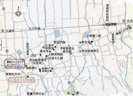 | ◆JR久大線:久留米から約20分で草野駅 ◆R210道の駅久留米≠フ緑化センター入口から南へ約1km進み、県R151/山辺の道を東へ進むと草野町へ出る。 |