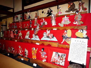 | 上野邸:おきあげ(竹串押絵雛) 明治初期に制作されたと推定され、百数十年を経ているにもかかわらず綺麗に保存されて非常に貴重な押絵雛である。江戸後期から明治にかけて日本全国の各地に押絵が制作され明治末期から大正、昭和十年頃までは、全国で押絵の商品が売買され民家の生活の中に入ってきた。 |